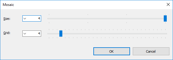 Mosaic enables you to mosaic images. From 1 to 4 pixels can be used to the size. And you can select use of grid lines.