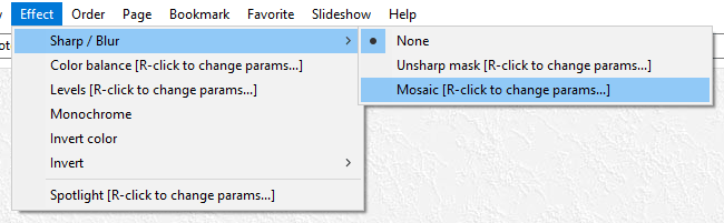 You can change mosaic parameters by a dialog. The dialog can be shown by right clicking the menu item "Mosaic".