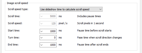Specify the total time to show the single image if the image can be scrolled. Total time means image scroll time plus pause times specified below. This value is used only when 'Use specified scroll time to calculate scroll speed'.