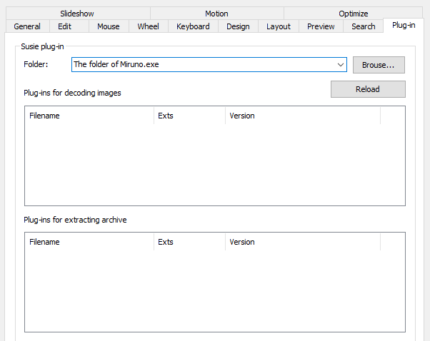 Input a folder path where to search susie plug-ins. The plug-ins must have ".spi" extentions to be discovered. You can select "Folder of Miruno.exe" to specify the folder where "Miruno.exe" exists.