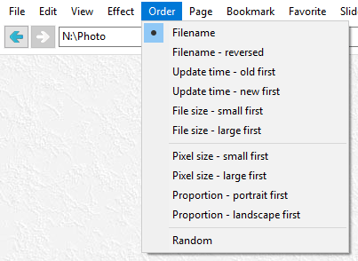 Images are ordered by proportions. Proportion is the rate horizontal pixel length versus vetical pixel length. It is useful for classify protrait and landscape photos. Images that have same proportion ordered by filename.