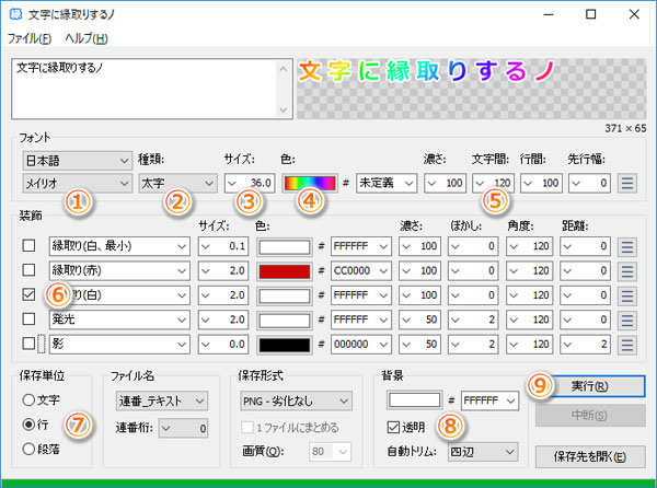 色ボタン (4) を押すと表示される、色の選択画面で、グラデーションタブを選択すると、ディフォルトで、虹の設定になっているので、虹で塗りつぶされます。あとは、実行ボタン (9) を押して、保存先フォルダーを指定すると、指定のフォルダーに文字画像が作成されます。